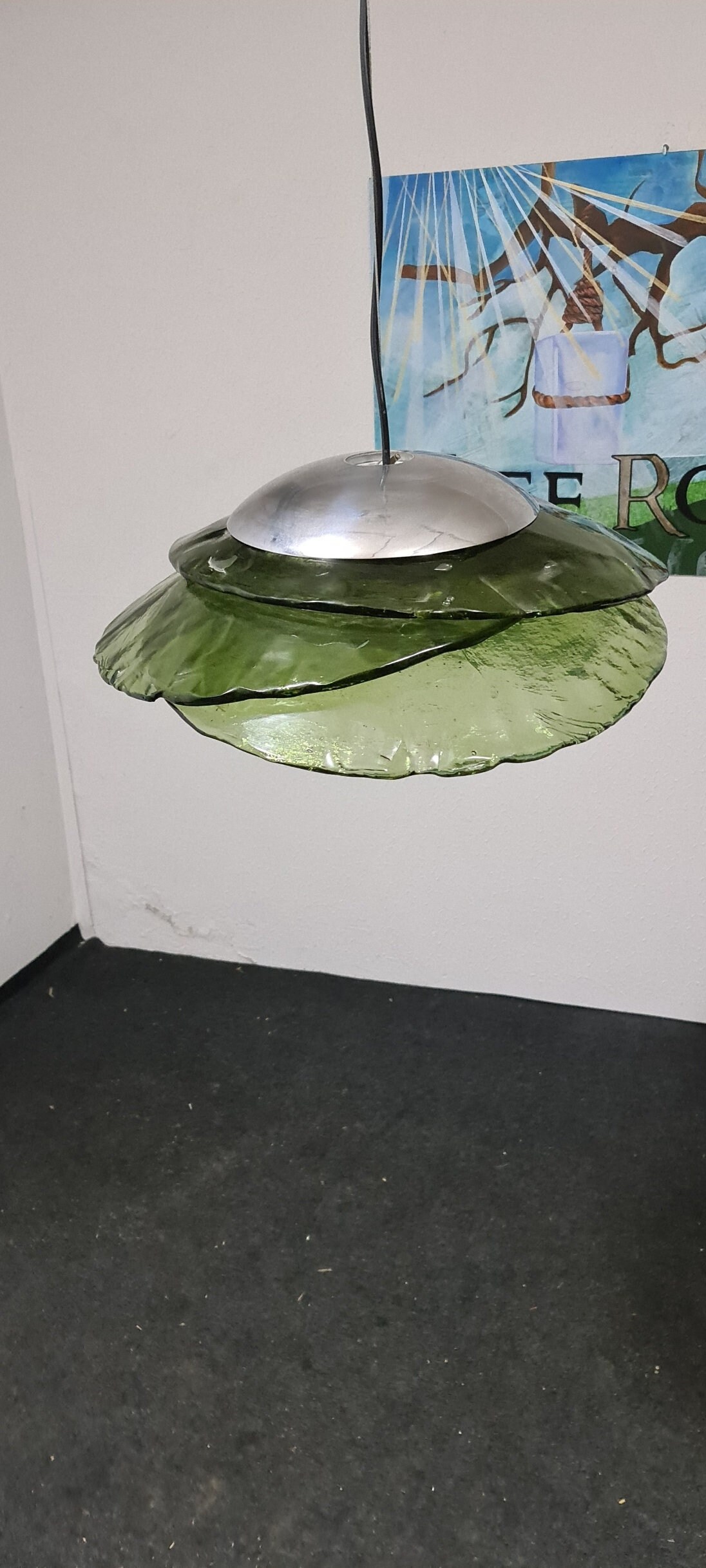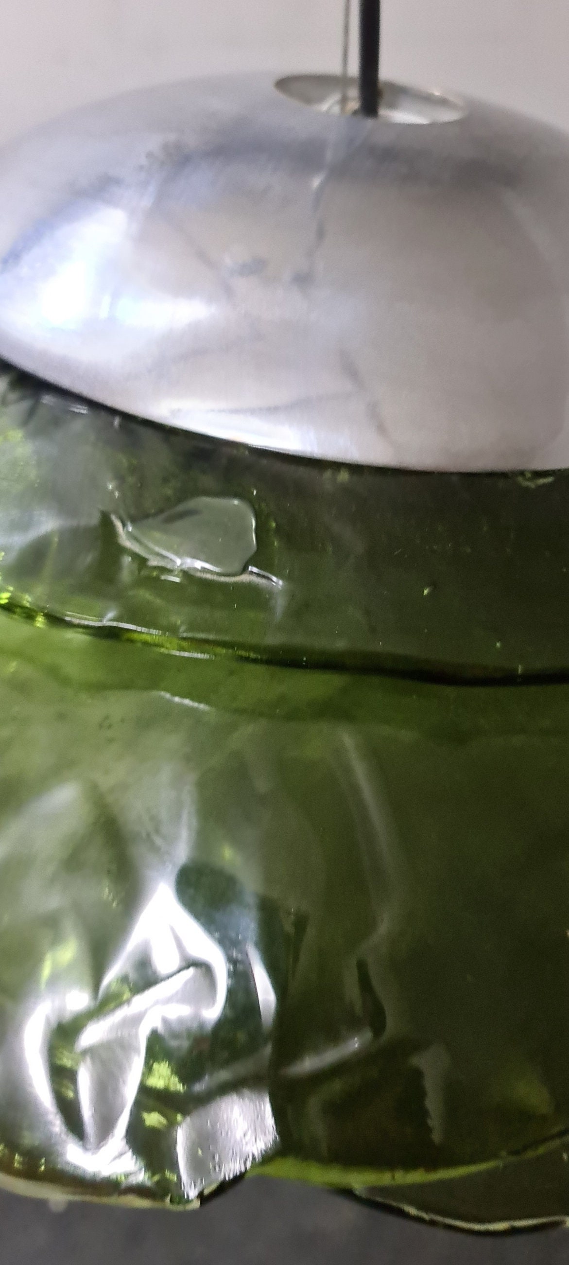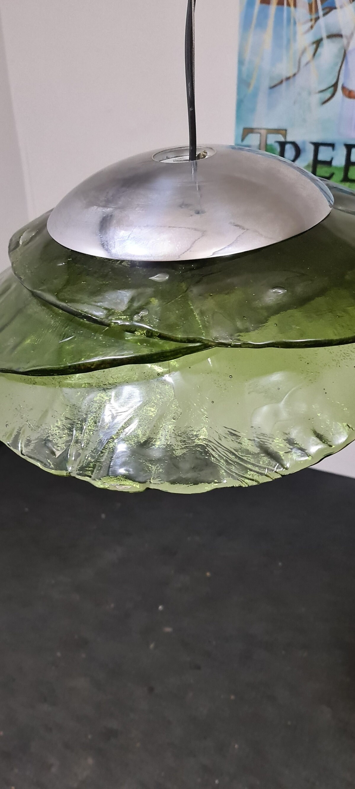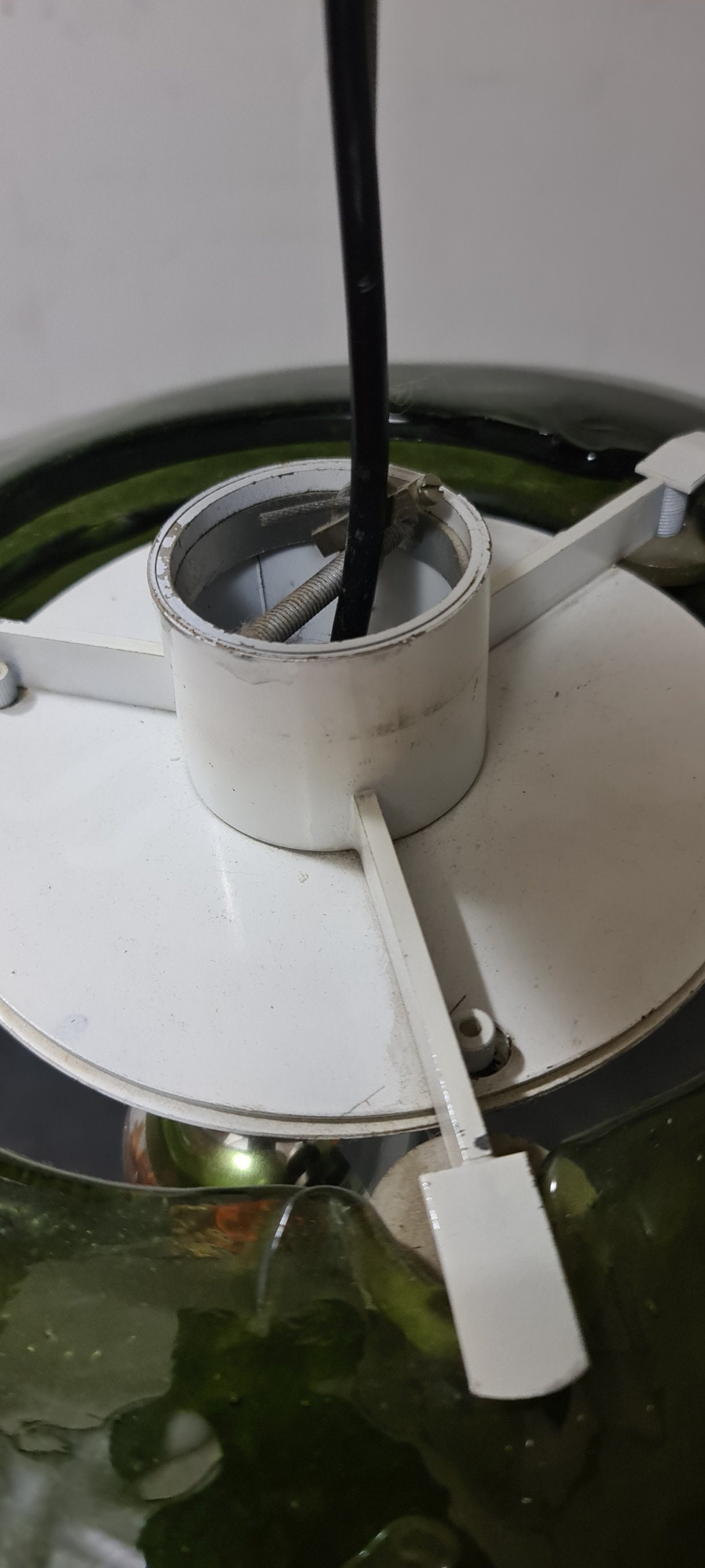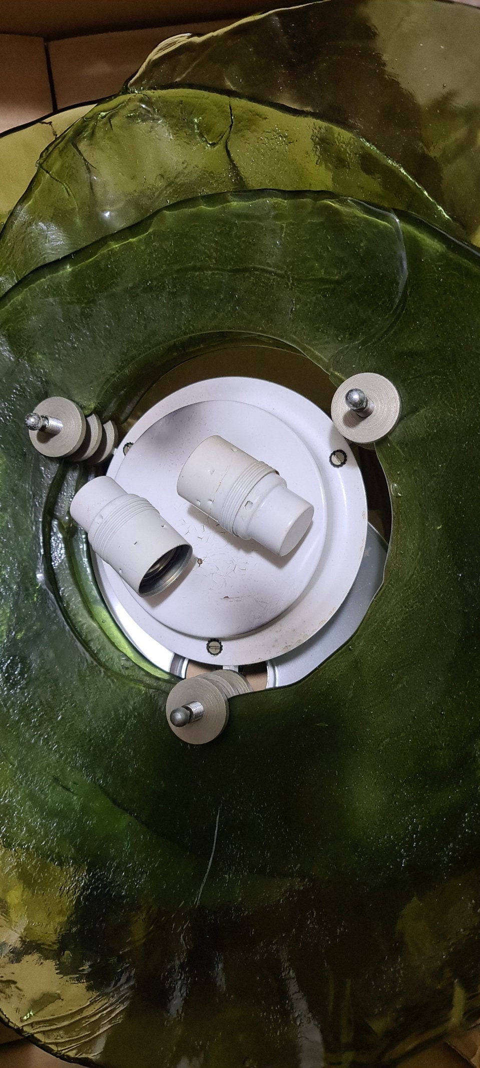 Vintage green glass pendant light. This item is well heavy at 10 kg. Has two E27/26 fittings. The condition is good; it is used but not abused, and the glass is not chipped or cracked. 51 cm across