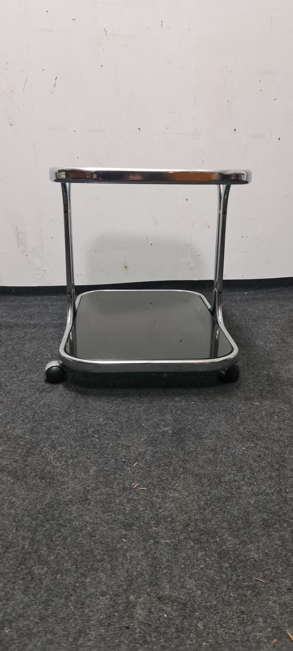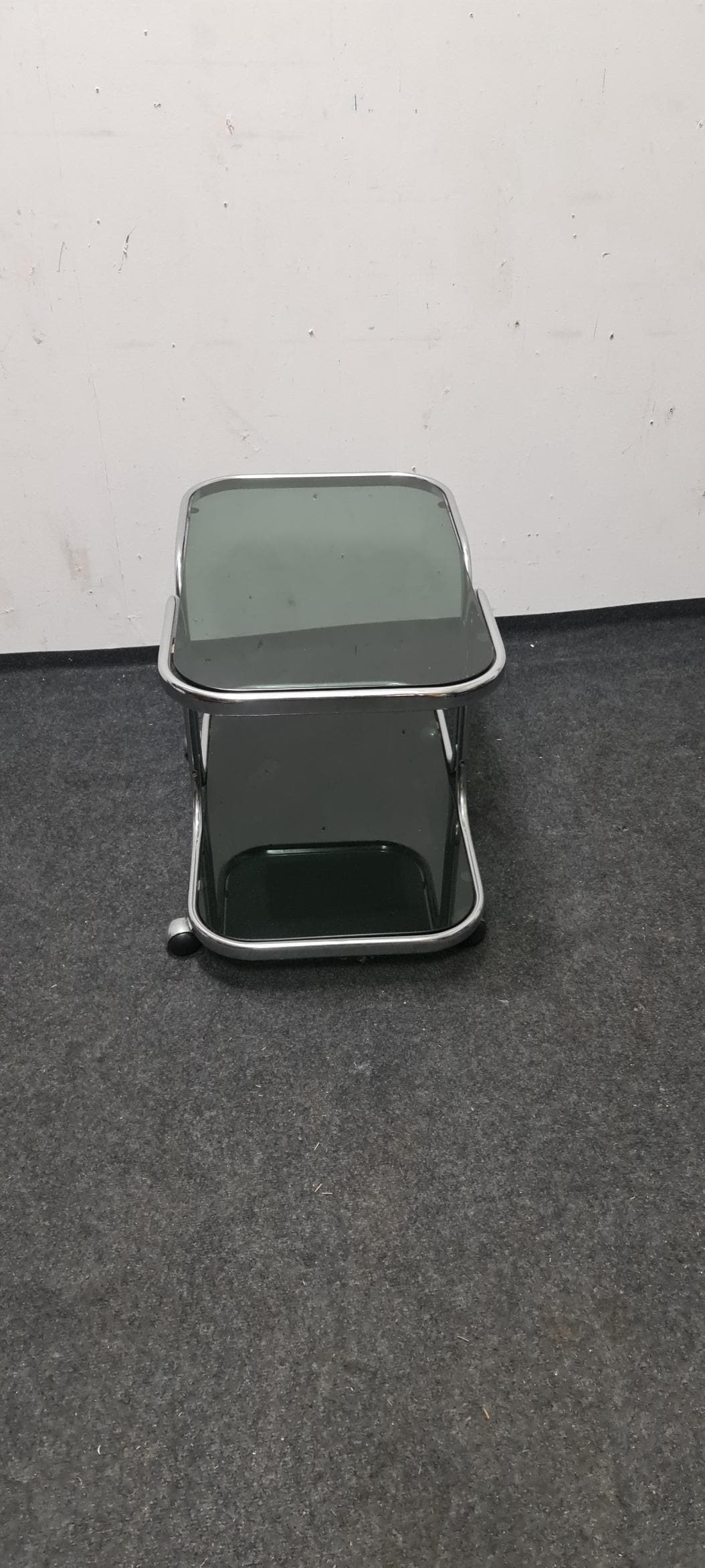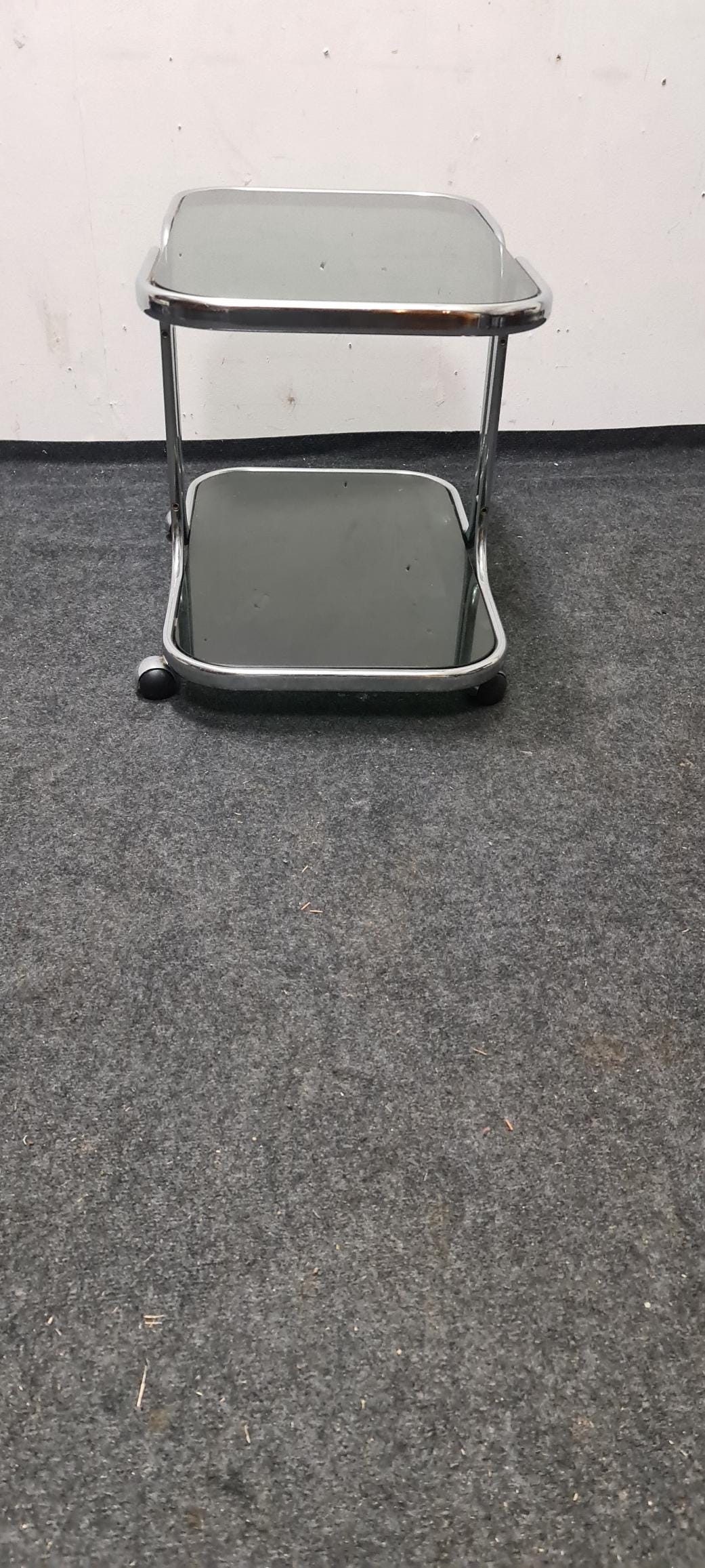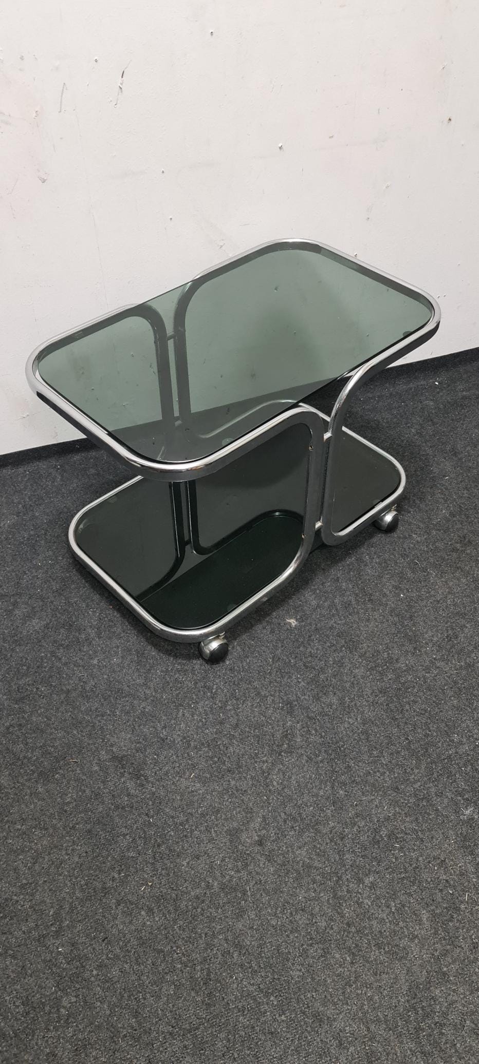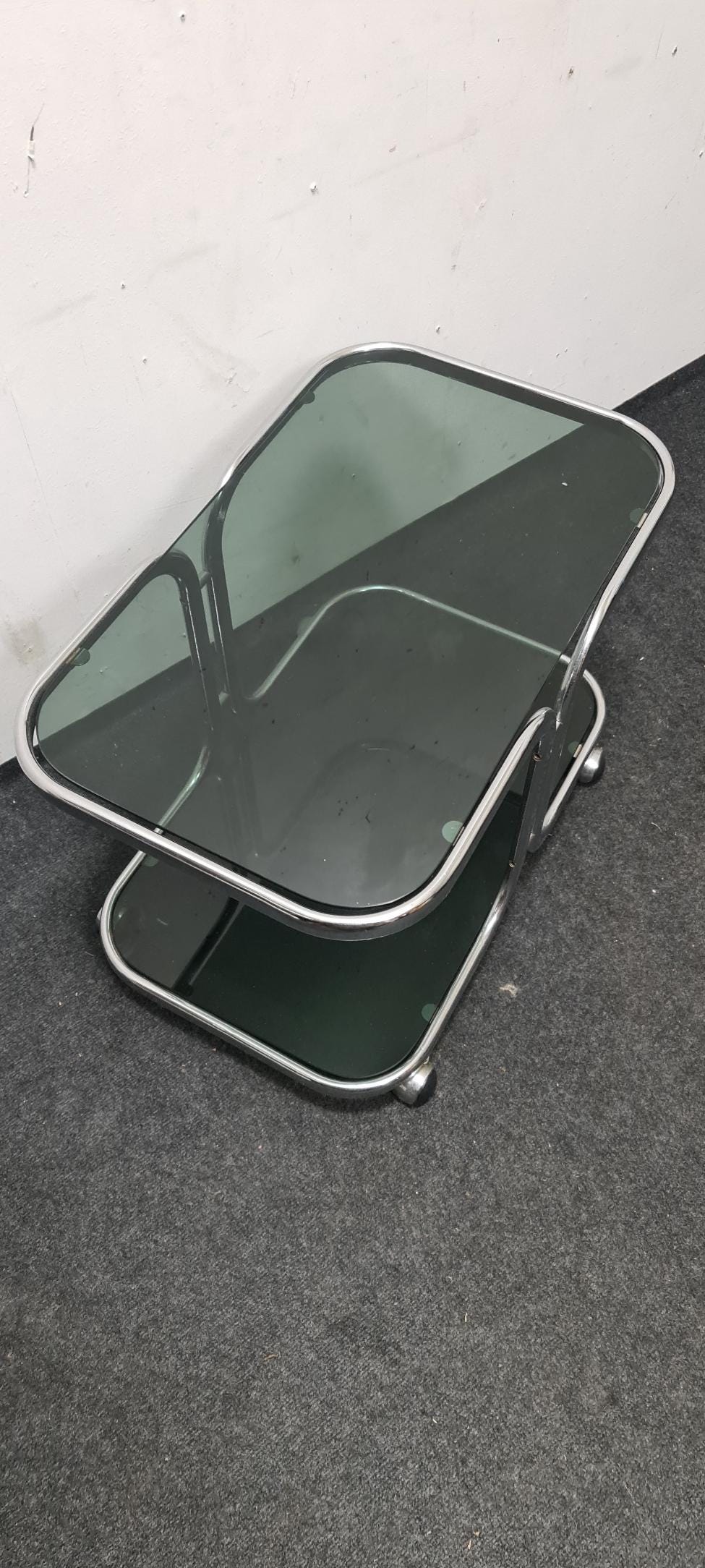 Vintage smoked glass and chromed metal ,end tabel or bar trolley , condition is good,used but not abused.