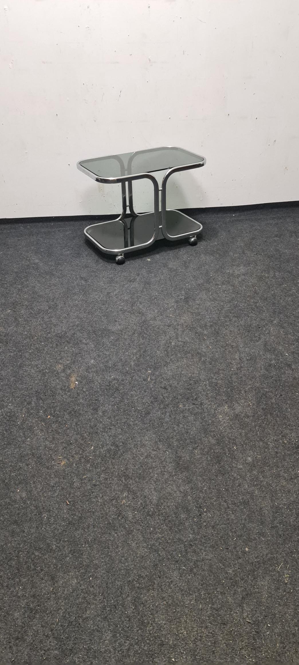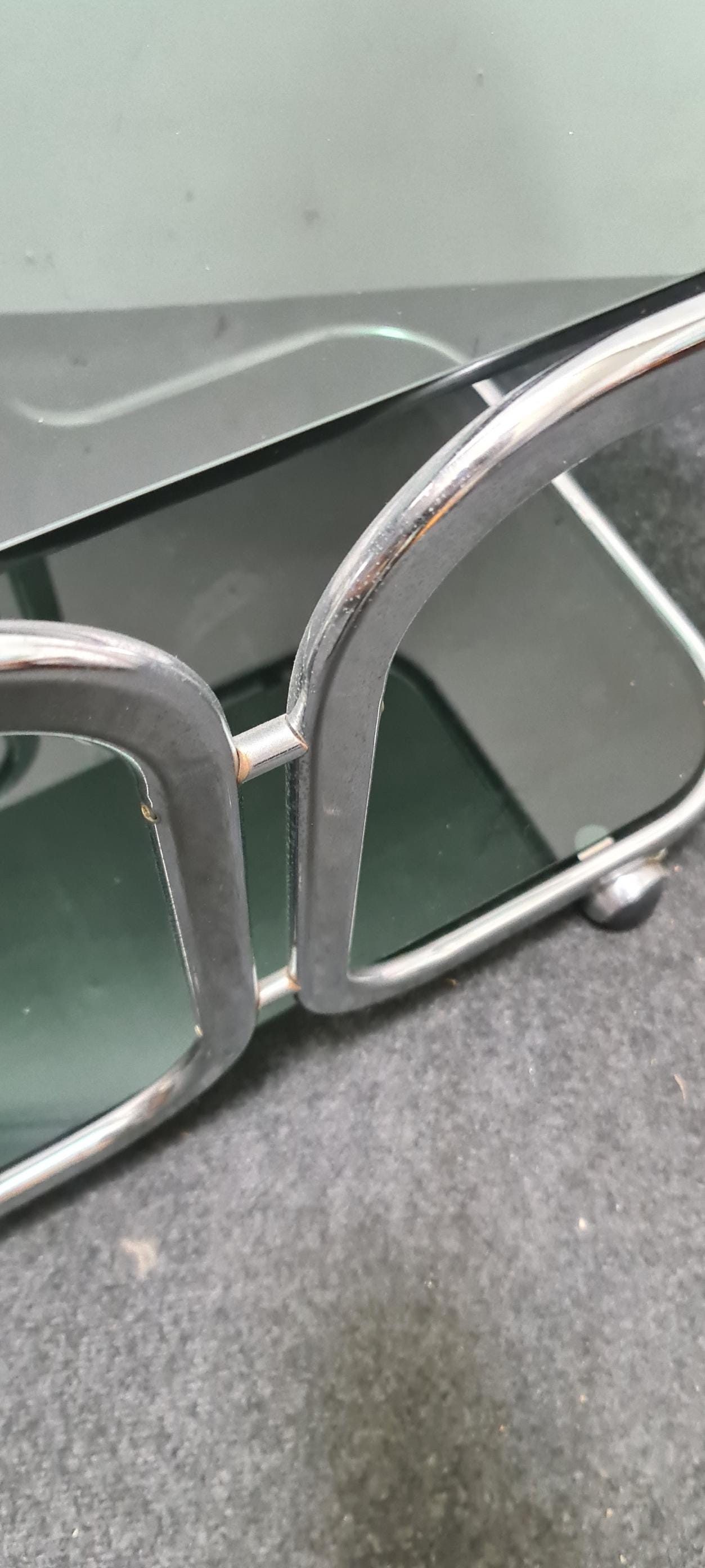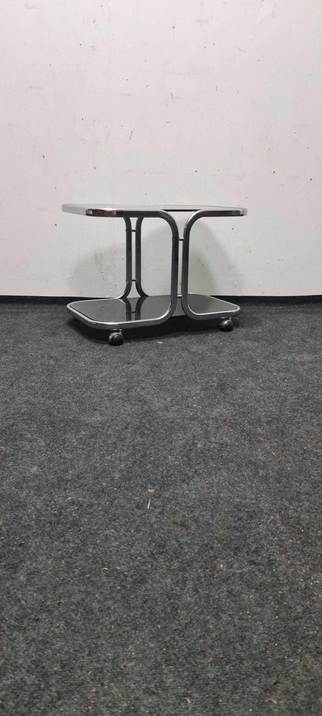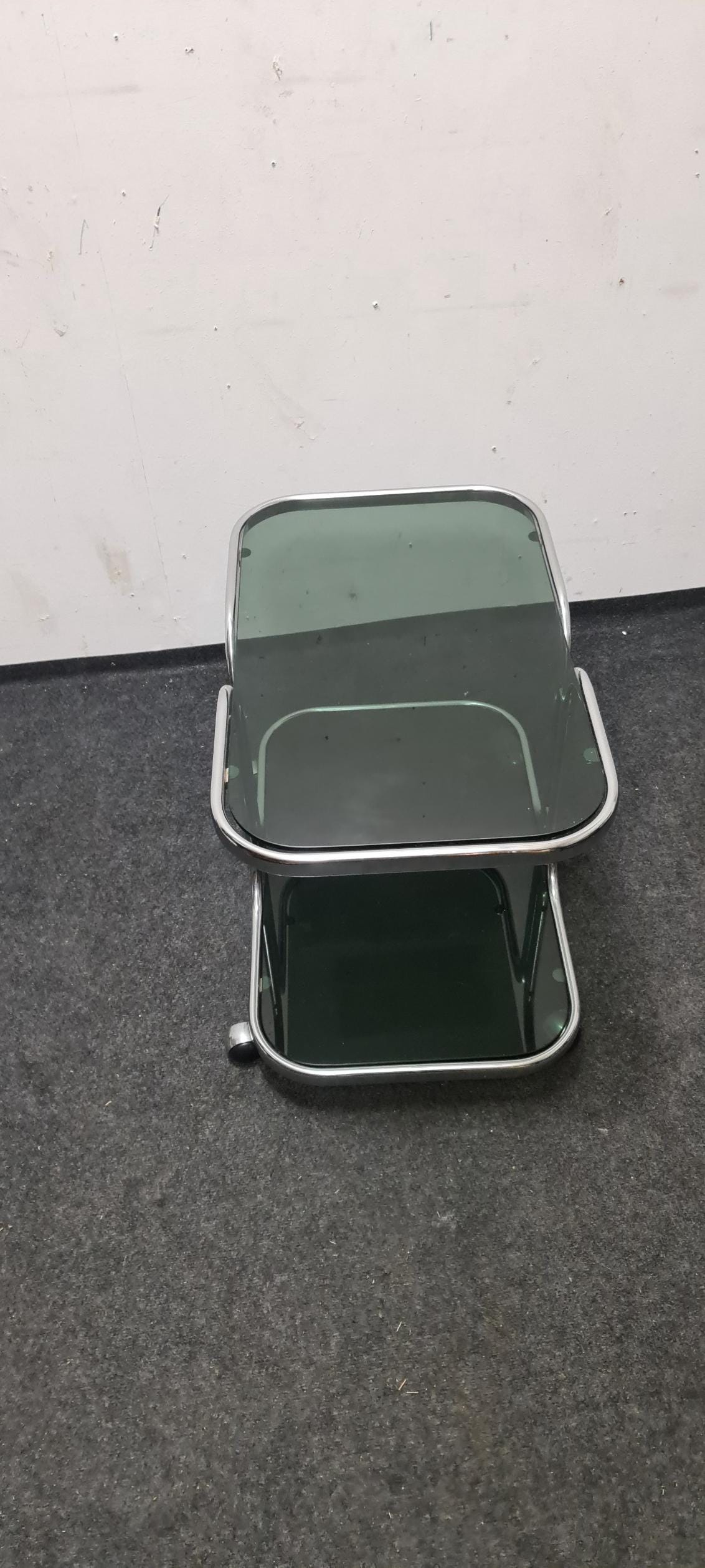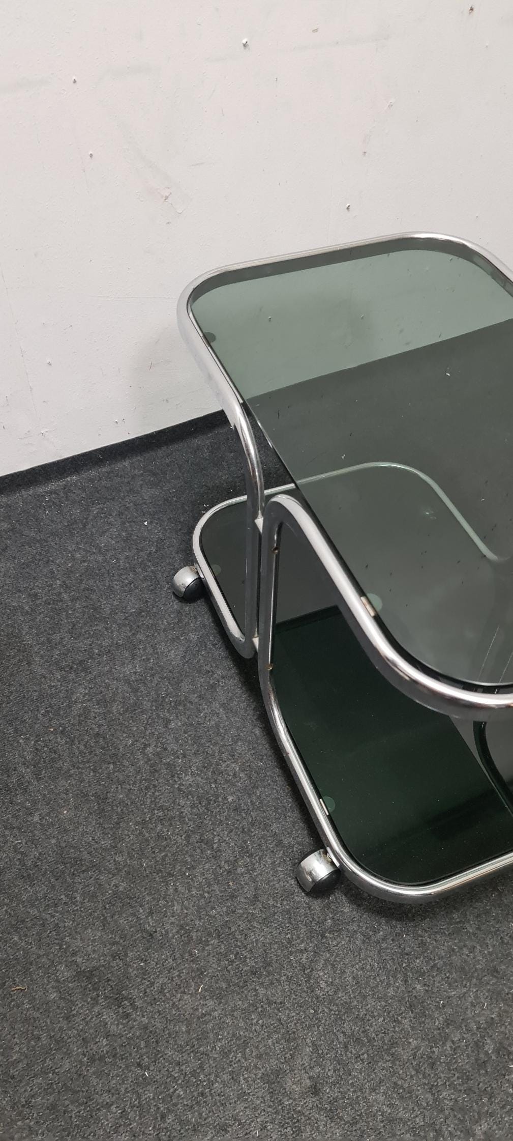 Vintage smoked glass and chromed metal ,end tabel or bar trolley , condition is good,used but not abused.