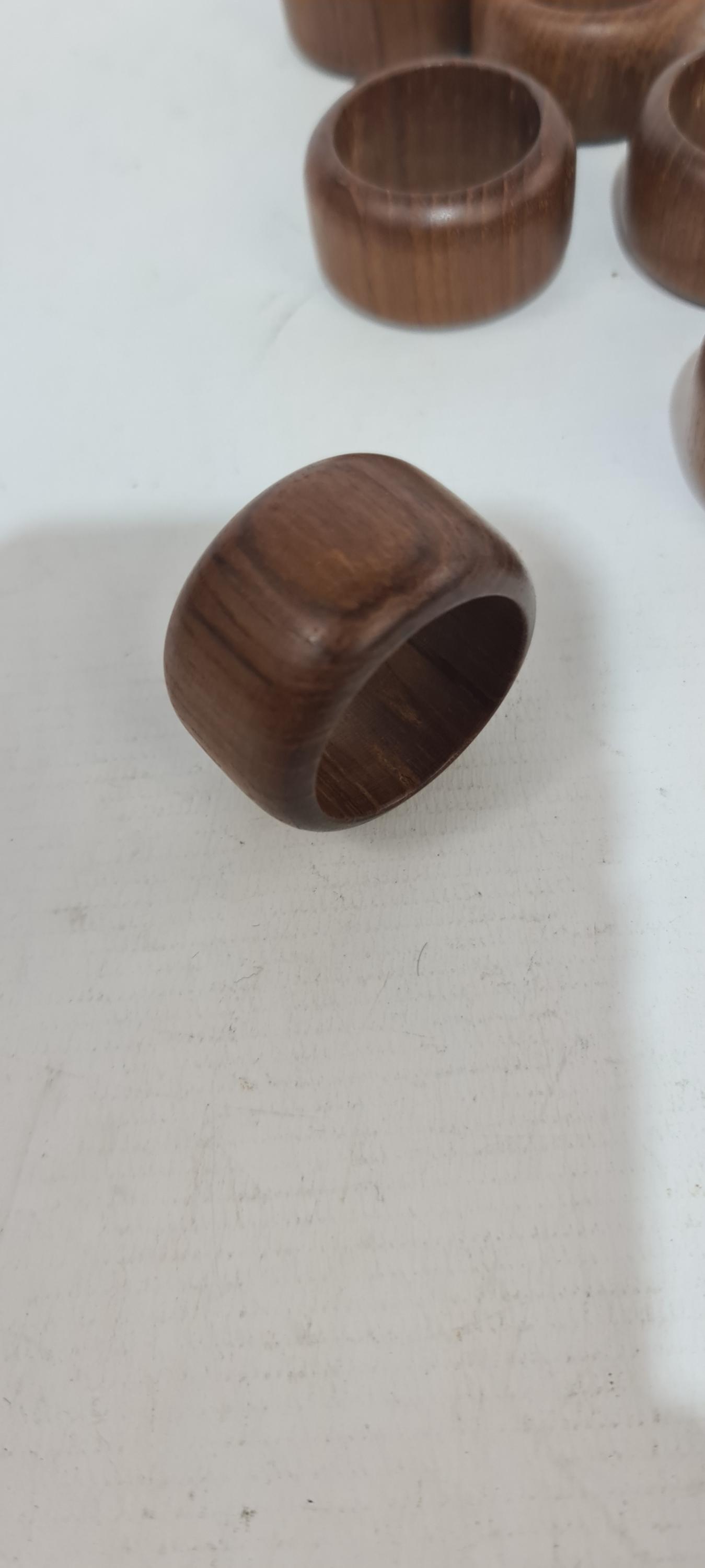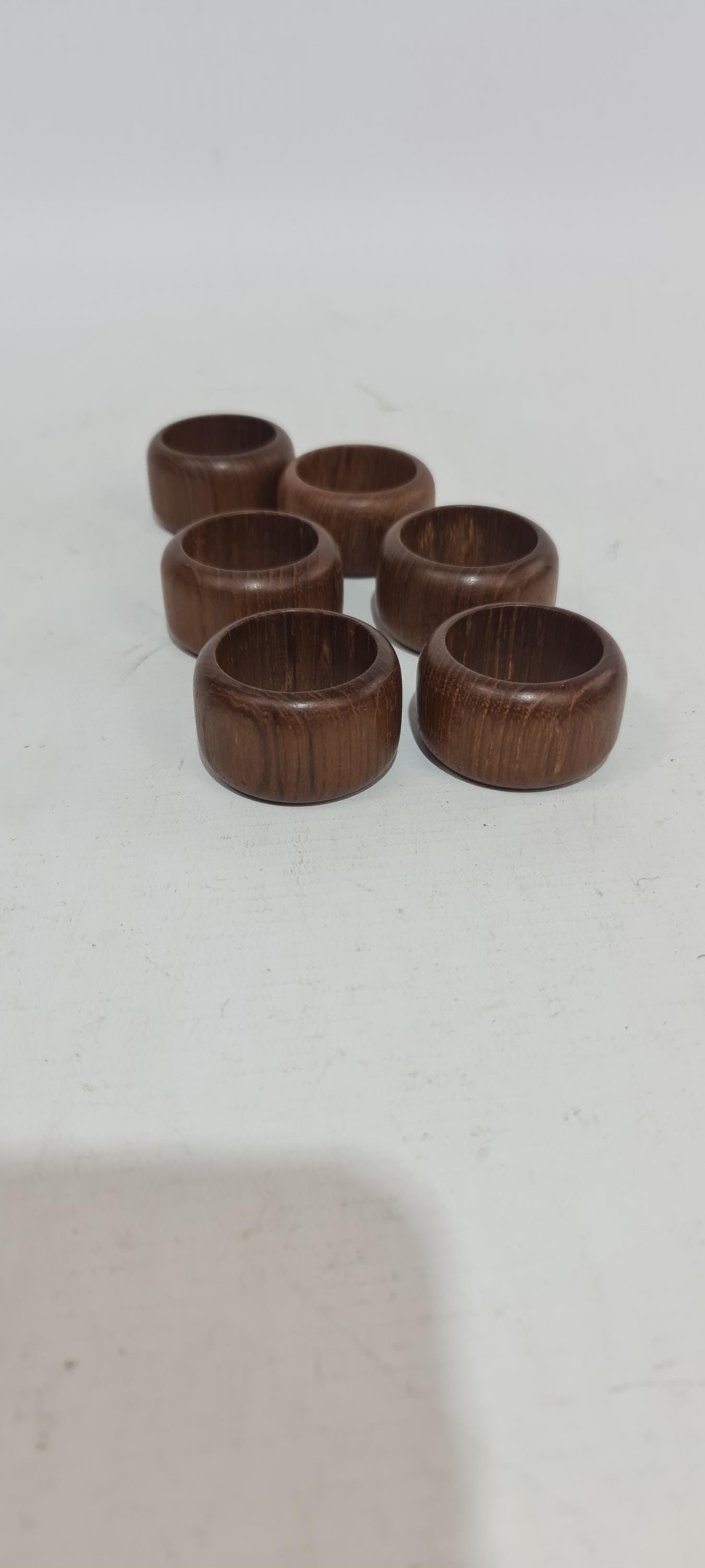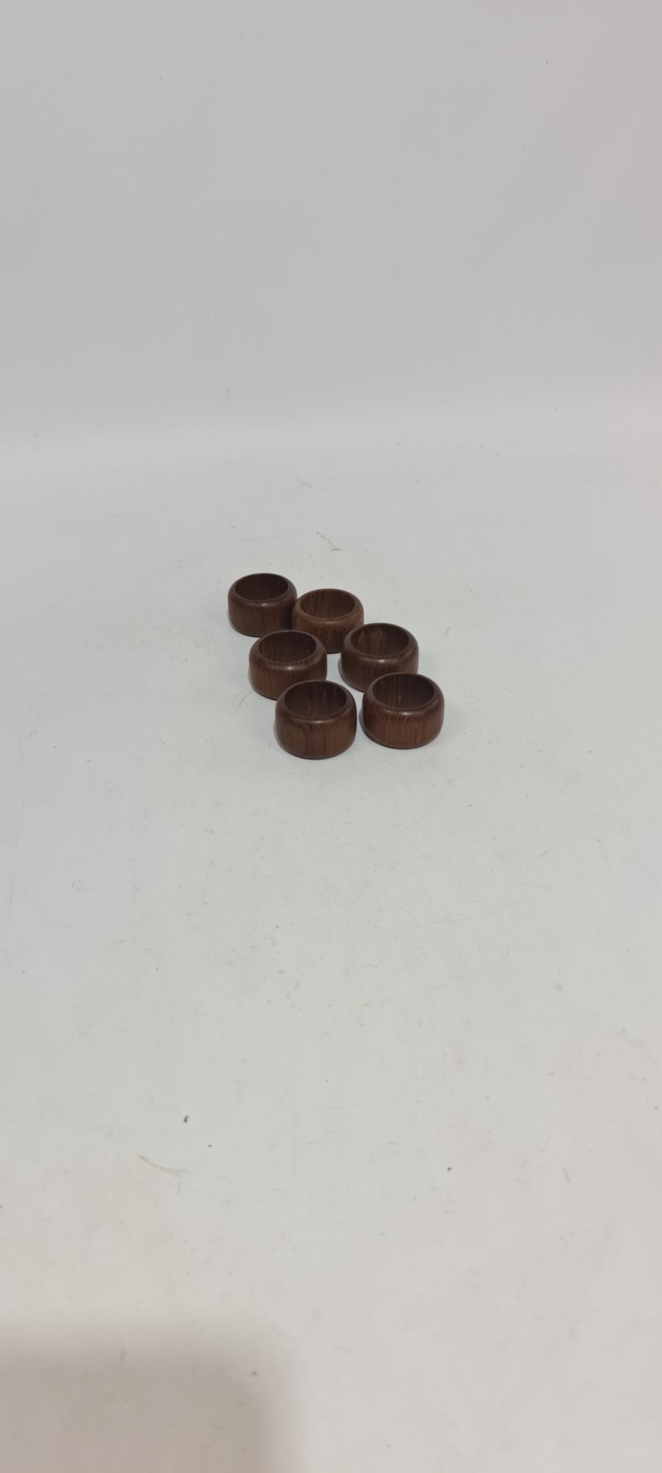 A set of six vintage teak napkin rings. Condition is good, used but not abused. Measurements are ca , 4.5 cm high x 3 cm wide.