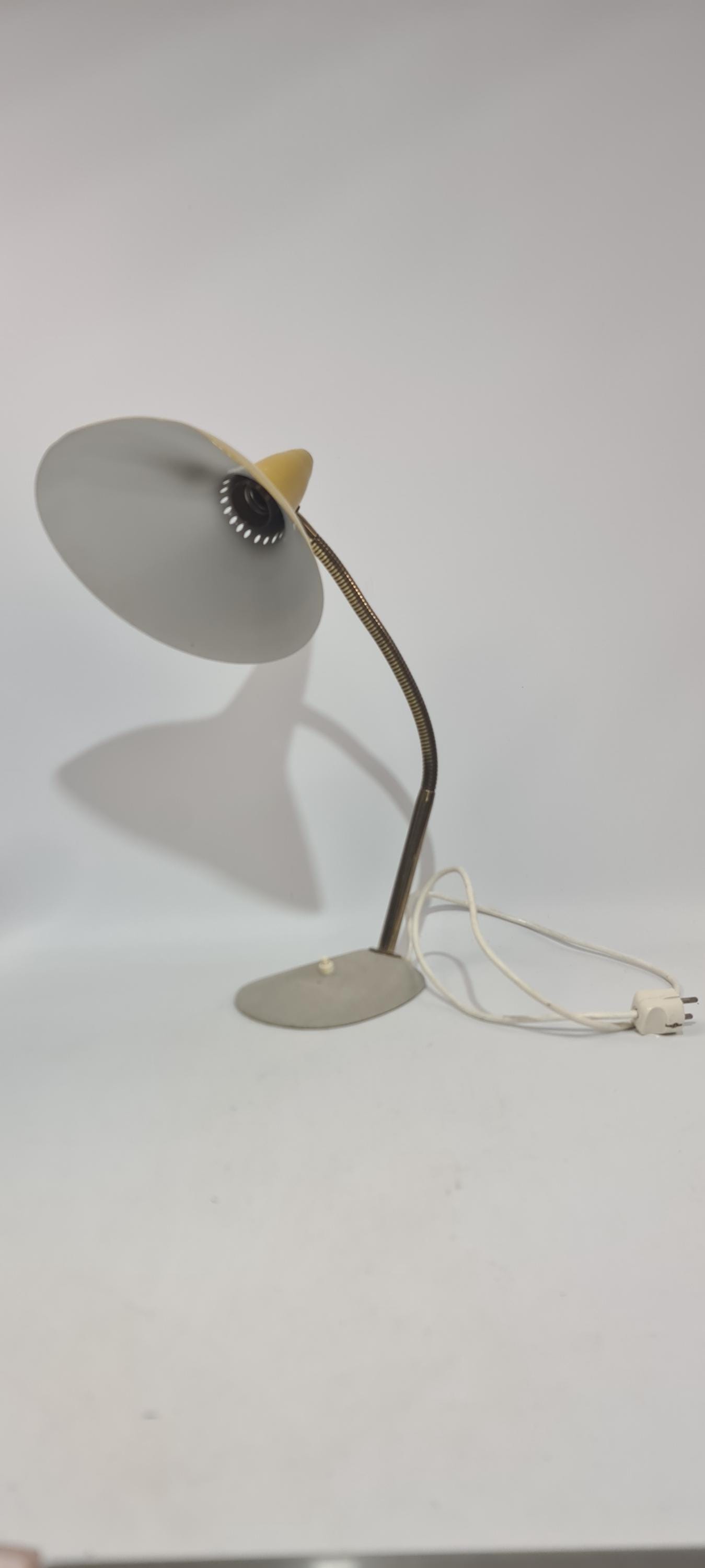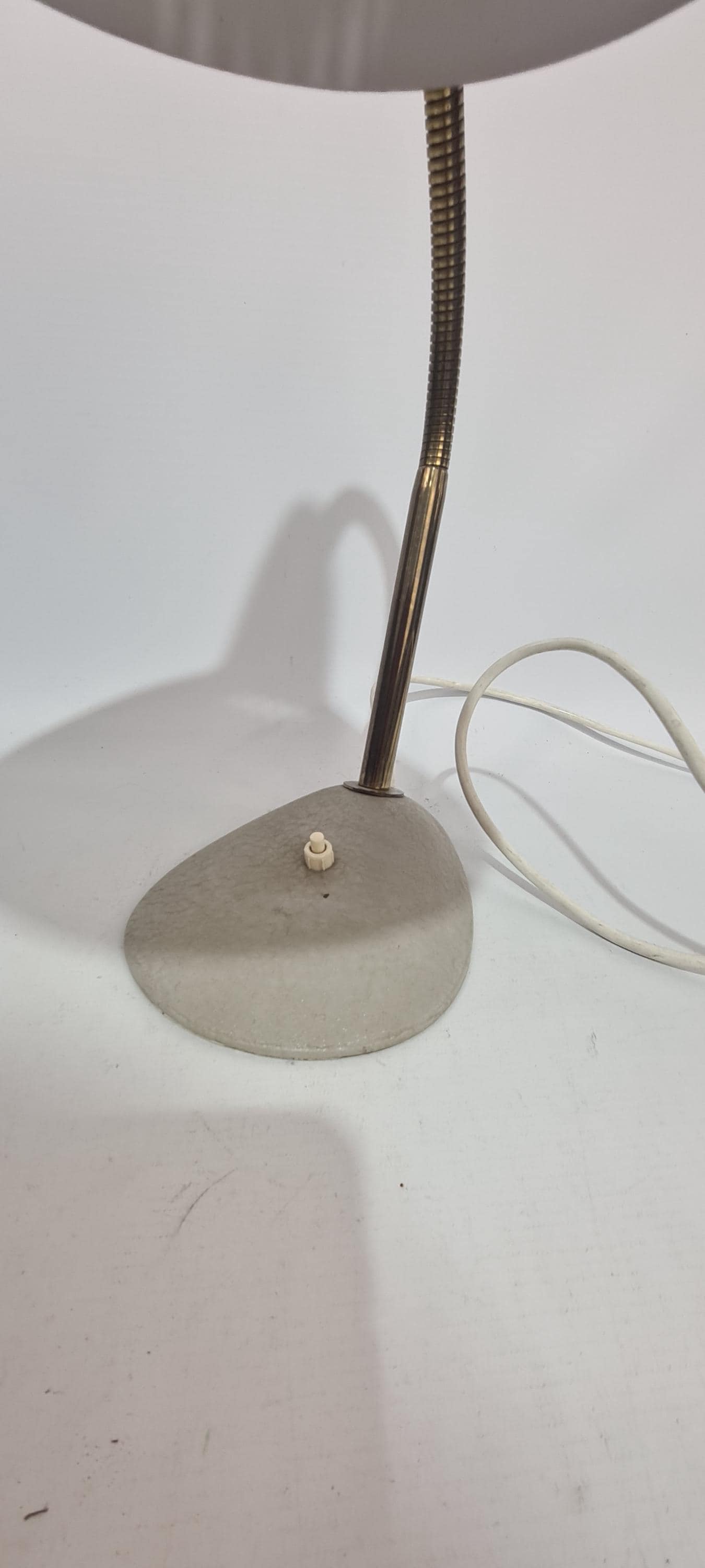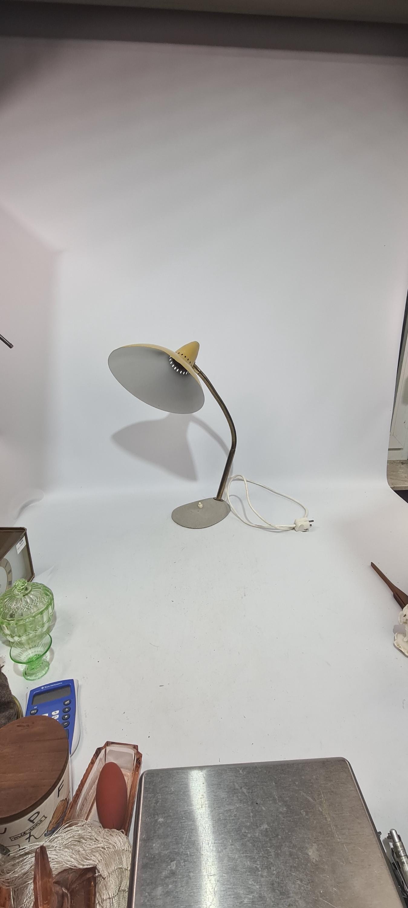 Vintage-industrial ,goose necked-desk lamp ,Bauhaus style even. Neck is good holds the weight of the shade well.Has a single E25/26 fitting atm a two pinned plug which can be changed to suit.