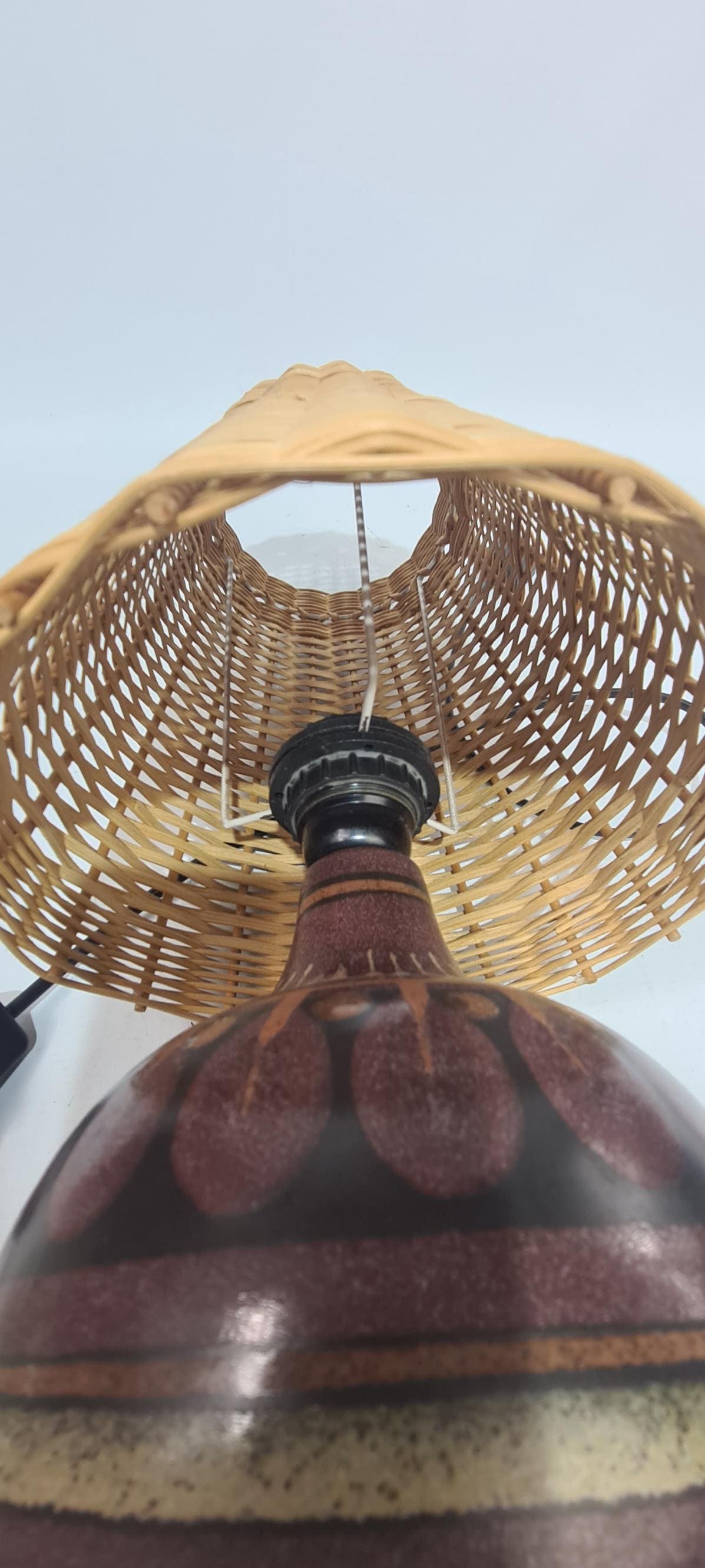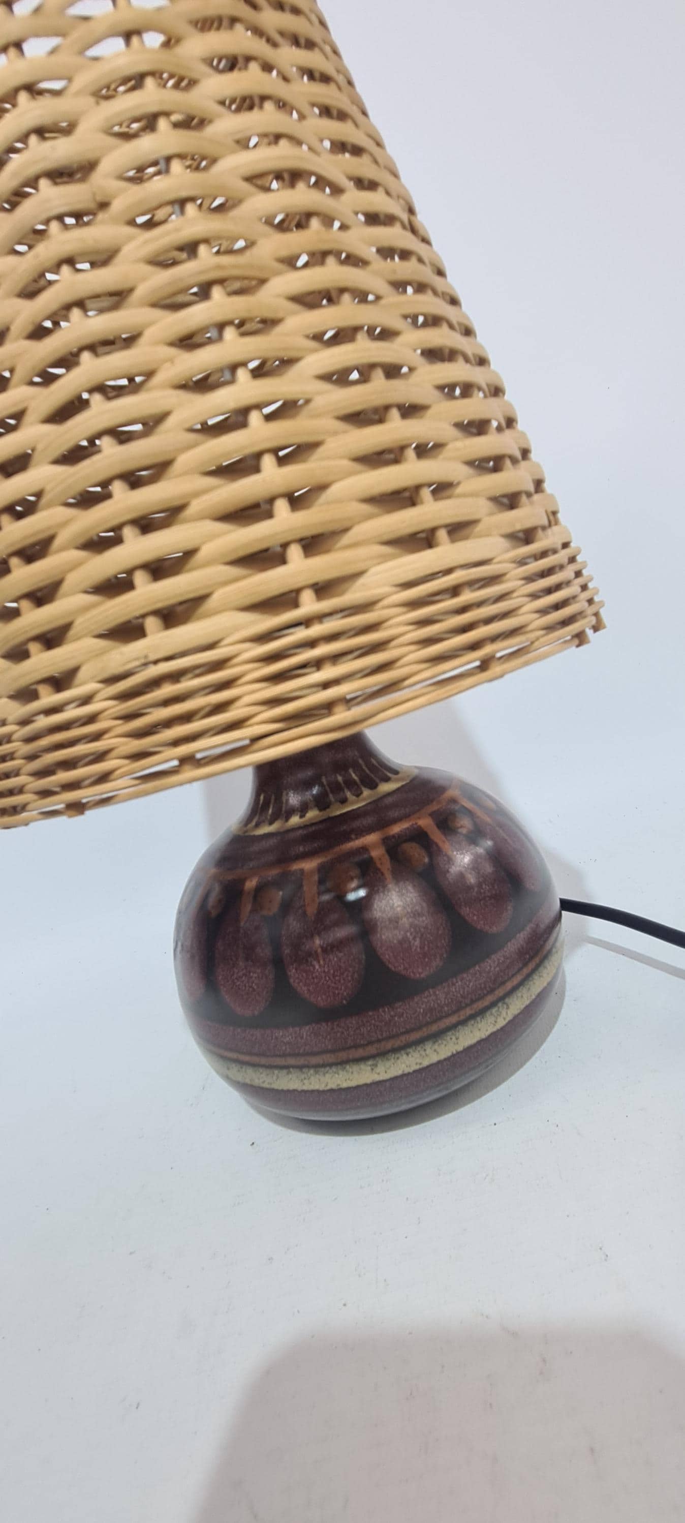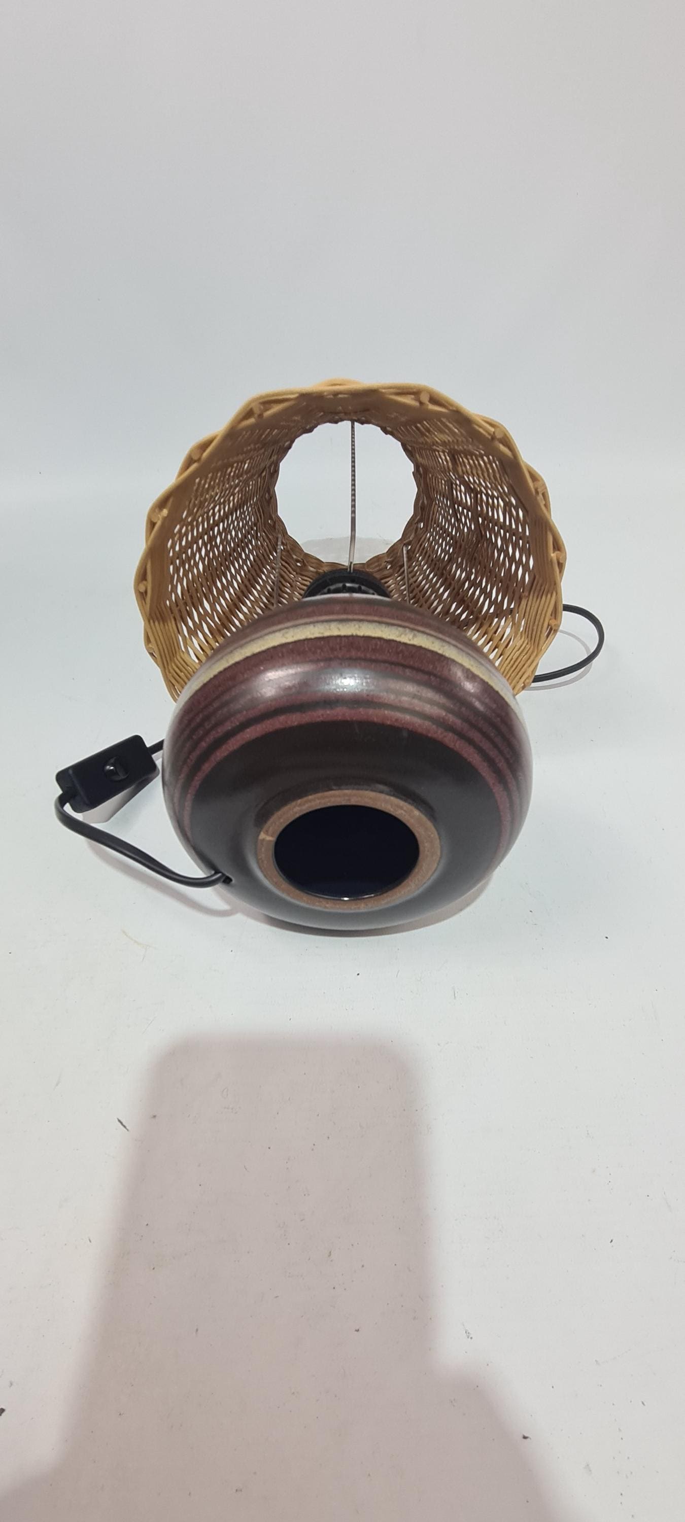 Vintage German side light. From the decor, it appears to be made by KMK Germany.Shade does it for me Wicker! Condition is good, used but not abused.