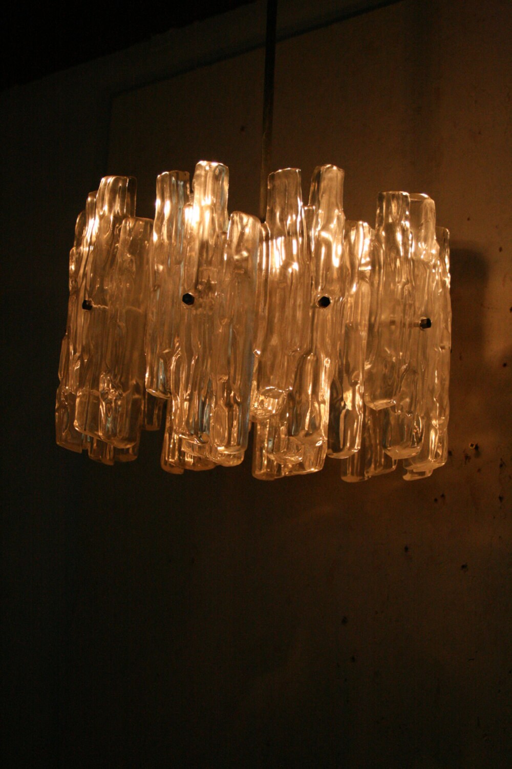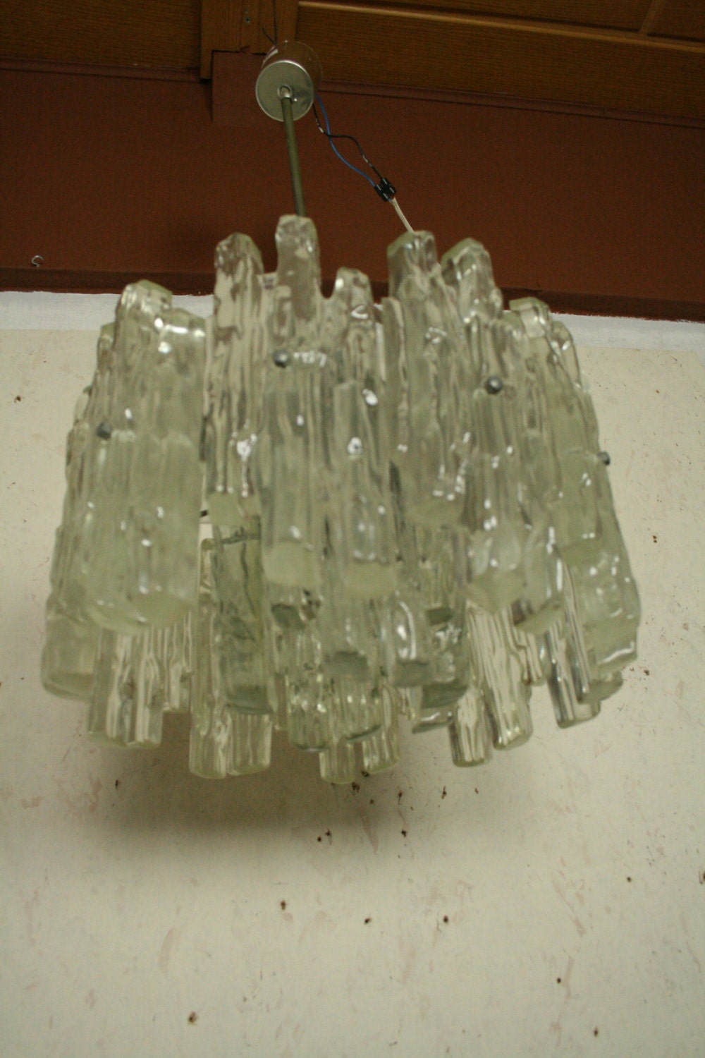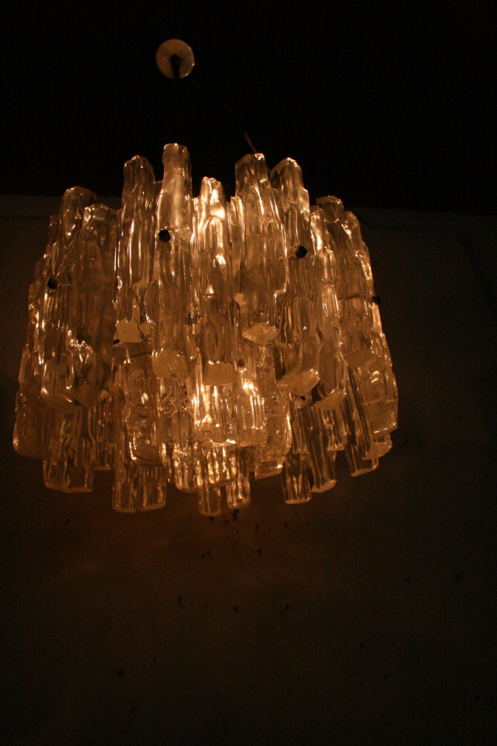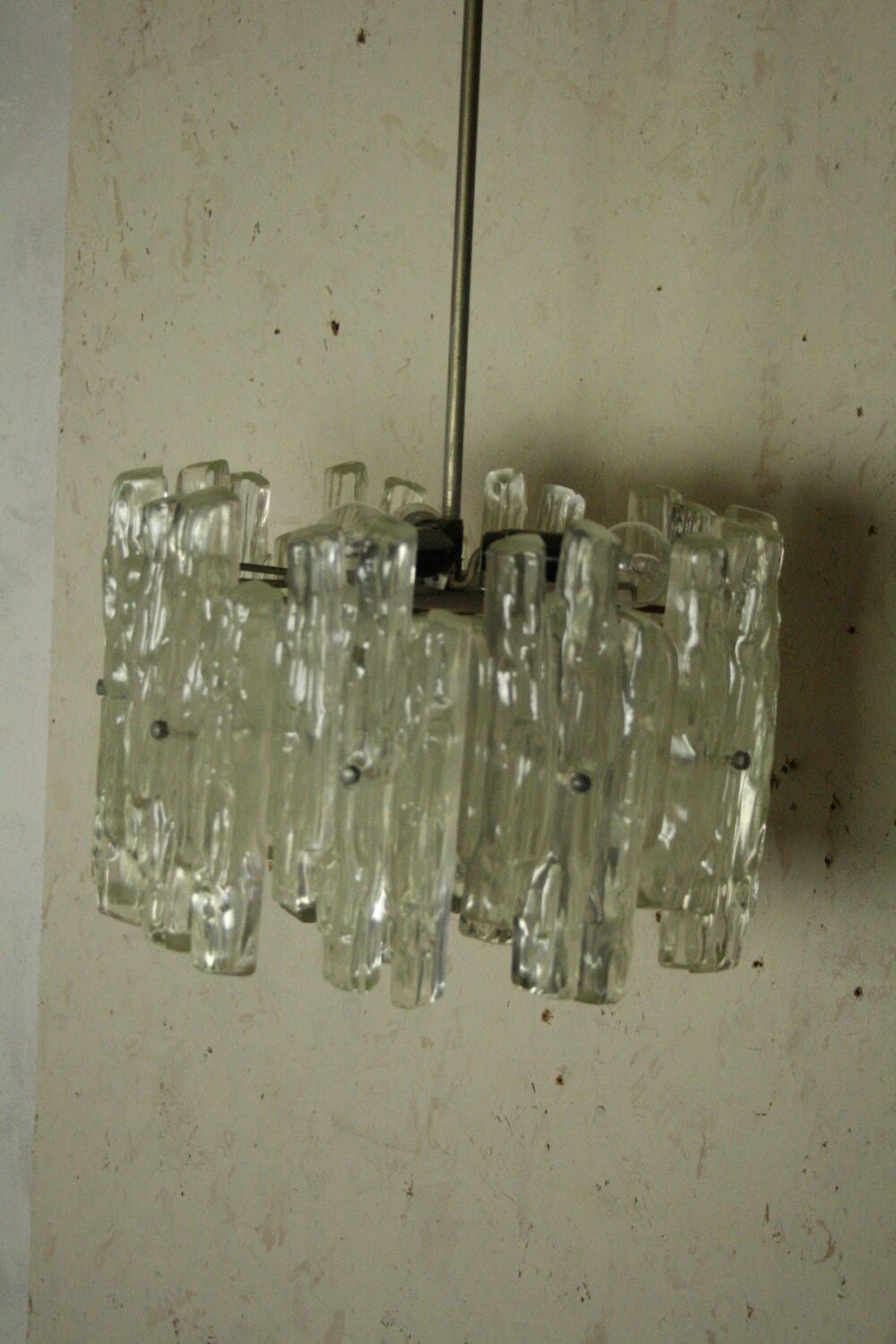 Not to many of these around i shouldnt think . Well big and heavy ...The icicle like plates are made of plastic the light that is given off pleasing and not blinding . It has 4 e 14 fittings stands at 25 cm high thats just the light and is 36 cm across .
