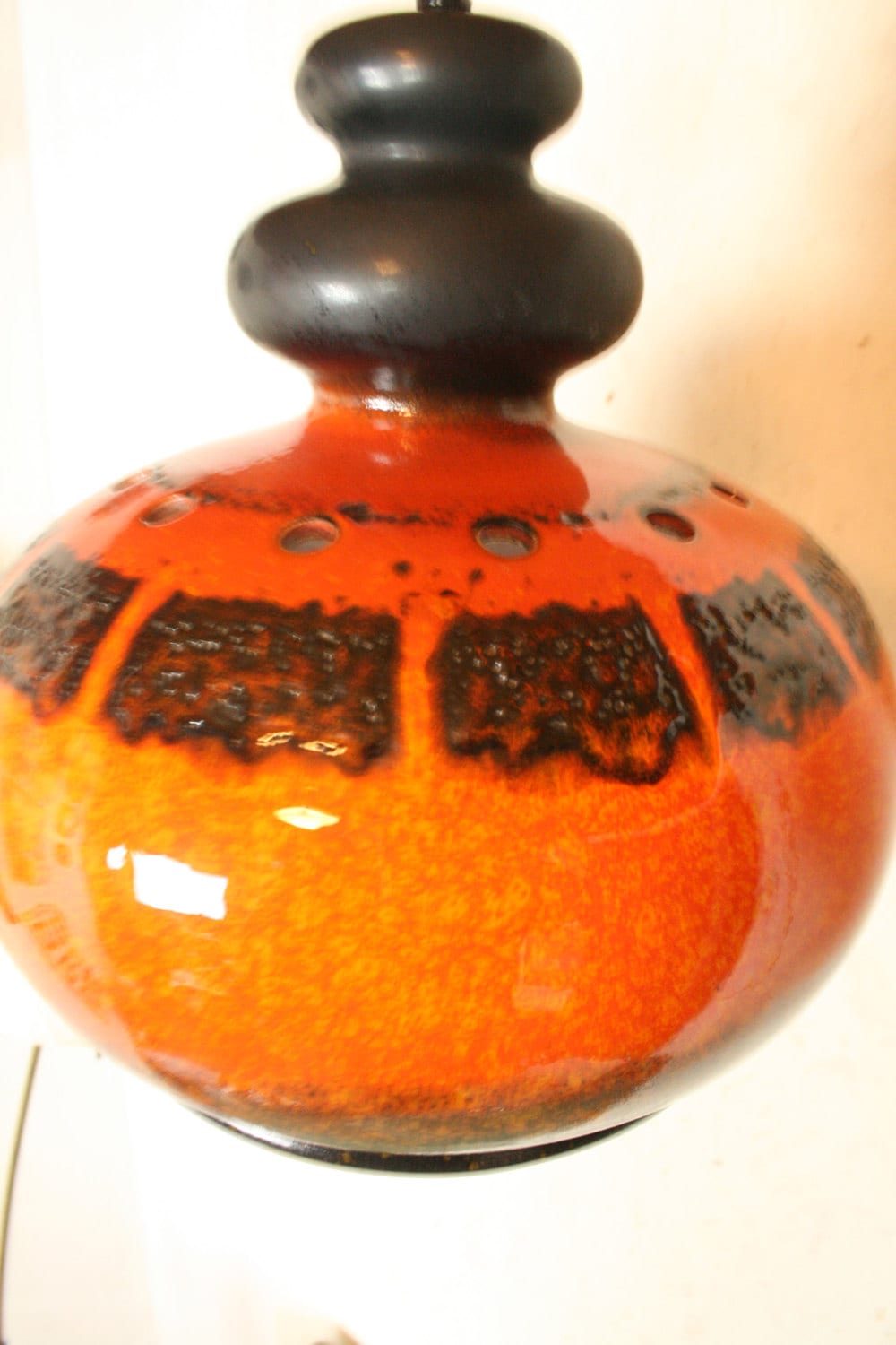 Smashing 70s ceramic hanging lamp .... Bright orangy with a bit of fatlava... Measures approximately 30 cm x 30 cm and has an e 27 fitting.