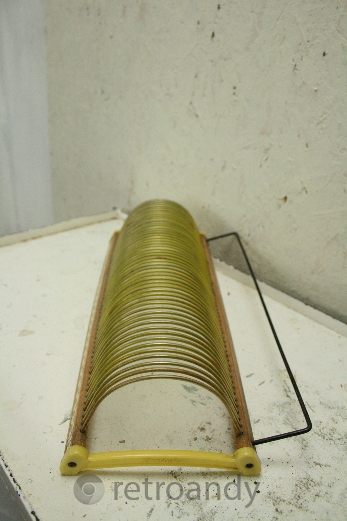 32 cm in length and ca 7 cm high yeah its a record holder but can hold many things perhaps letters or just sit there and be cool . Over all good vintage condition with some signs of wear..