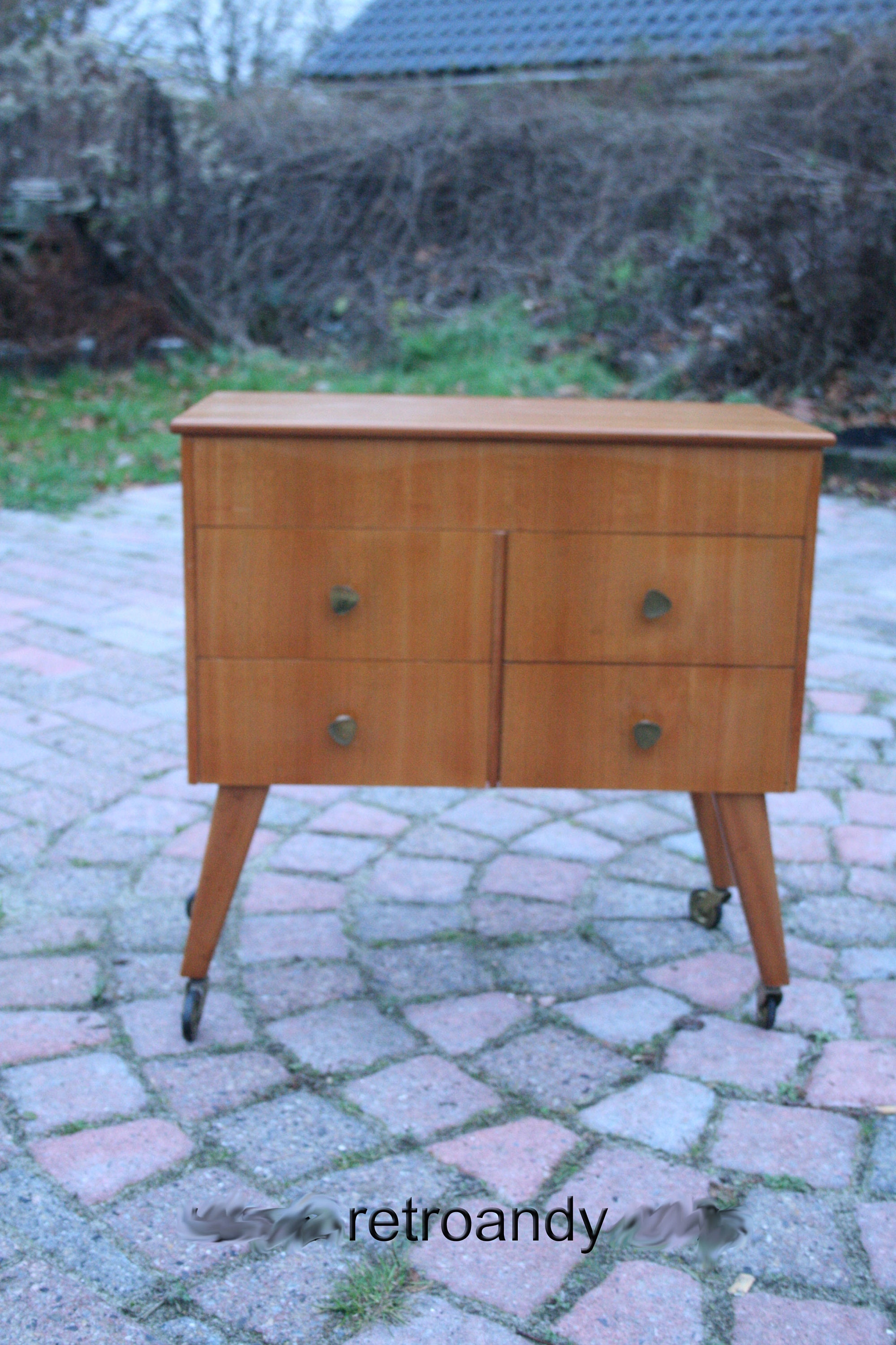 Im sure teak vernier sewing box on legs . TBH easy used as side table with the possibility to store ones nik naks . Overall good vintage condition .